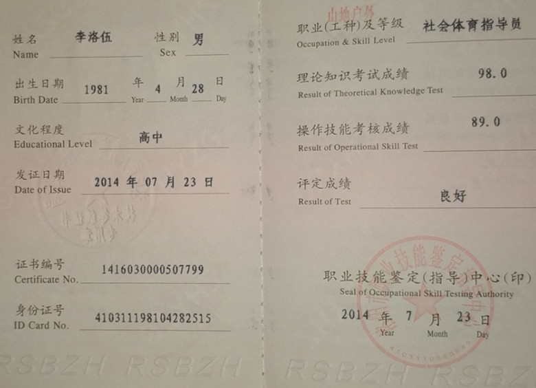 我本人自2012年8月开始涉足户外运动,并与2014年7月23日取得户外登山领队证(社会体育指导员——山地户外,由洛阳市职业技能鉴定指导中心盖章签发。)